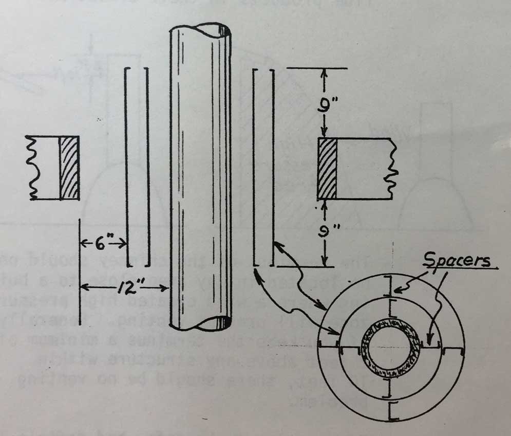 assembly, the clearance between the chimney and the nearest combustible material may be reduced to 12 inches provided the metal chimney is guarded by a metal thimble extending at least 9 inches above and 9 inches below the roof construction. Such thimbles shall have double cylindrical walls with a ventilated space between the walls and between the metal chimney and thimble, and the clearance between the metal thimble and the combustible material shall be at least 6 inches." The preceding sketch may make this a little clearer.Regarding clearances for brick chimneys, I can find nothing in existing codes which apply and would therefore recommend that this be discussed with the enforcing authorities in your area. It is generally accepted throughout the gas industry that no combustible material should be, permitted to reach a temperature in excess of 45'C (117 F) above ambient. The onus is on you as a potter to see that these temperatures are not exceeded and should be checked on your first firing. It is vital to remember that the temperature of the outside wall of the kiln and chimney continues to rise for some hours after the kiln burners have been turned off.