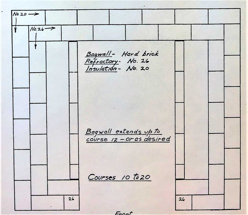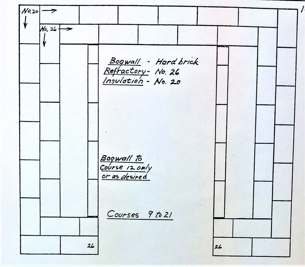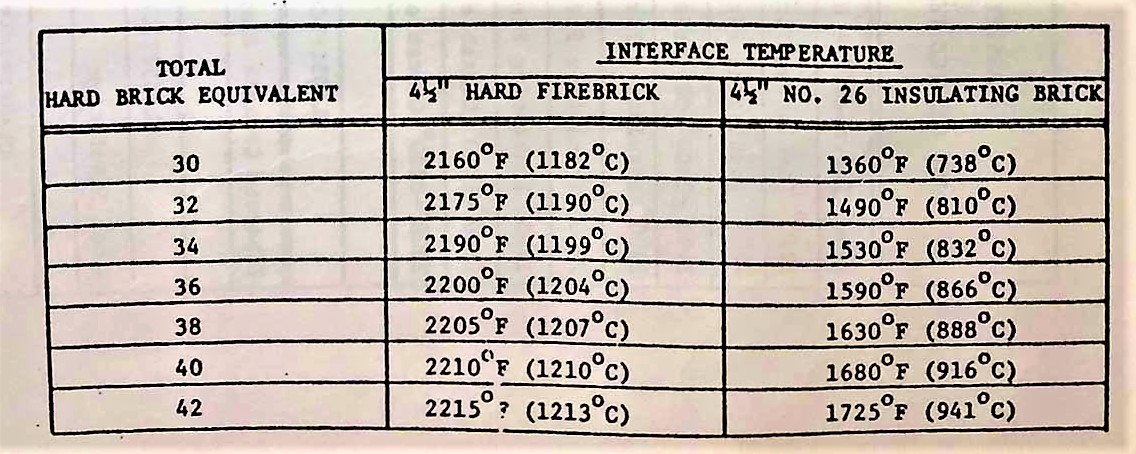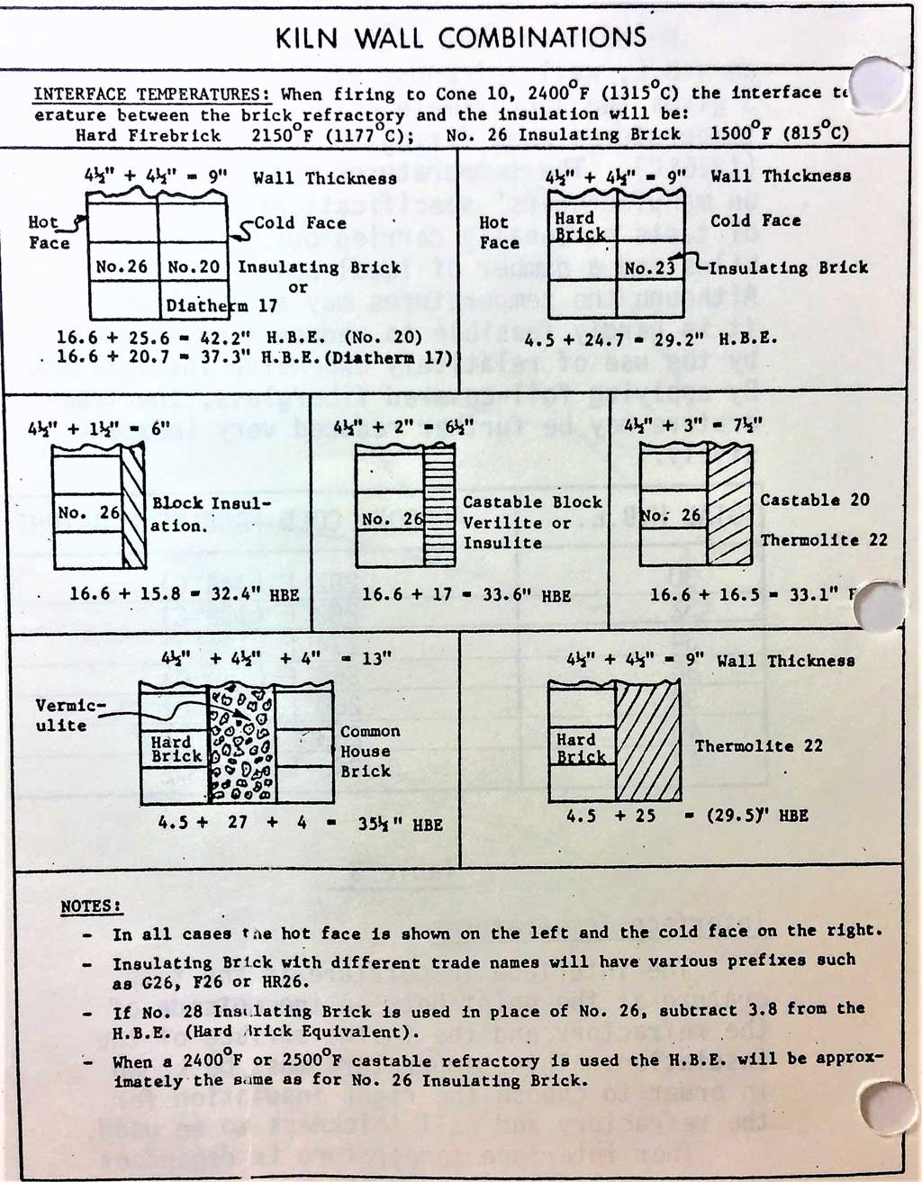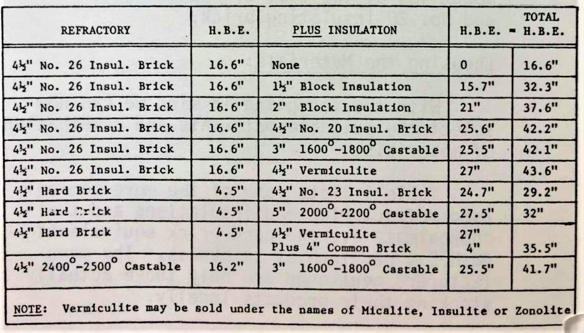 Building materials are open to choice. By far the most popular has been 4½" of No. 26 Insulating Firebrick insulated with 1½" of 1900°F block insulation. It provides a wall only 6½" with a hard brick equivalent of 32.4" and is the easiest to build for the first time builder. Second and third choices have been No. 26 with No. 20 insulating firebricks; and hard firebrick insulated with No. 23 insulating brick.