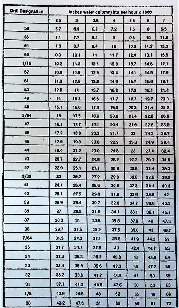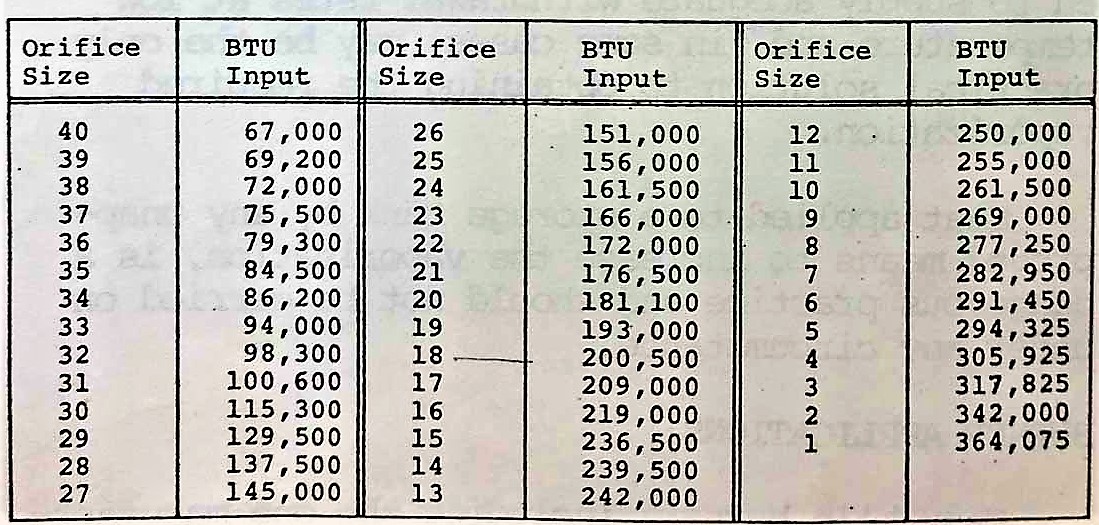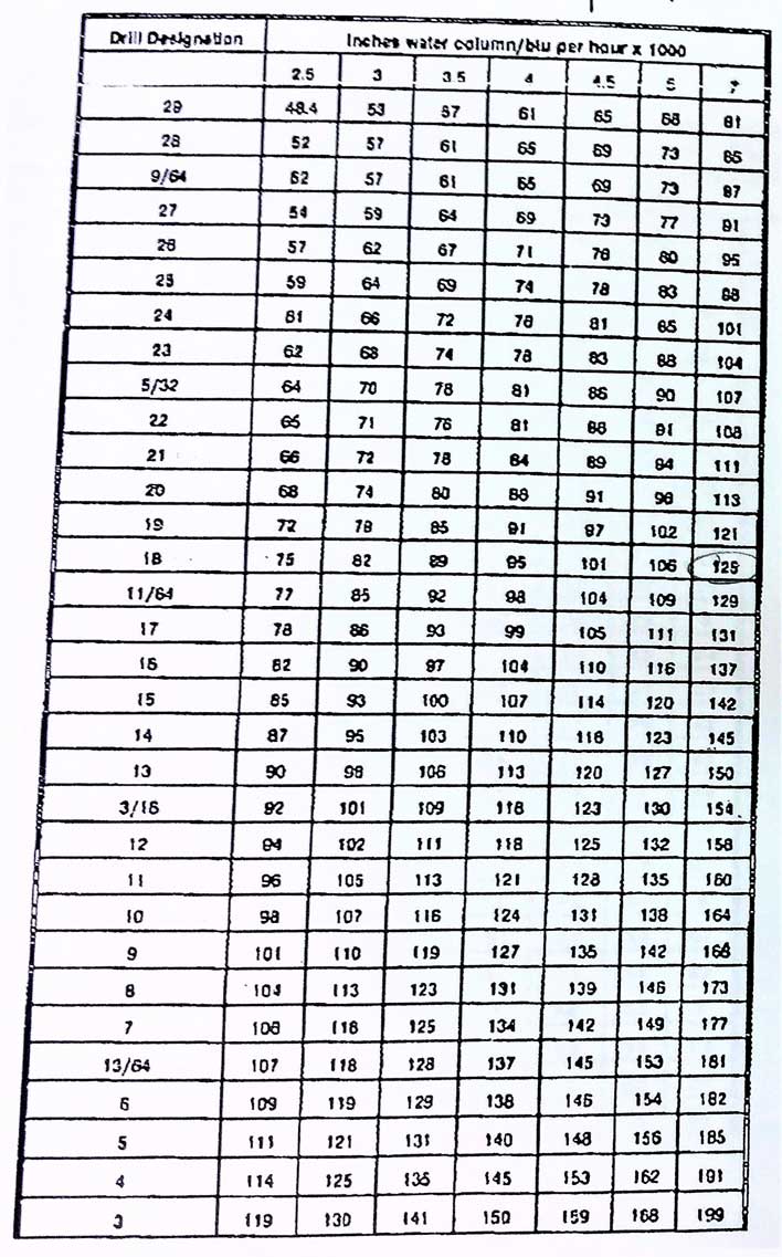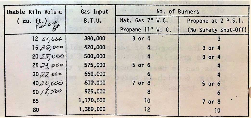 The "Heritage" type of atmospheric kiln burner is fired at 125,000 BTU on natural gas at 7 in-water-column pressure and on propane at from 11 in-water-column to 2 psi pressure. On propane at 2 psi, one burner can handle 170,000 BTU but one must keep in mind that automatic safety shut-off valves have a maximum rating of ½ psi (14 in-water-column).