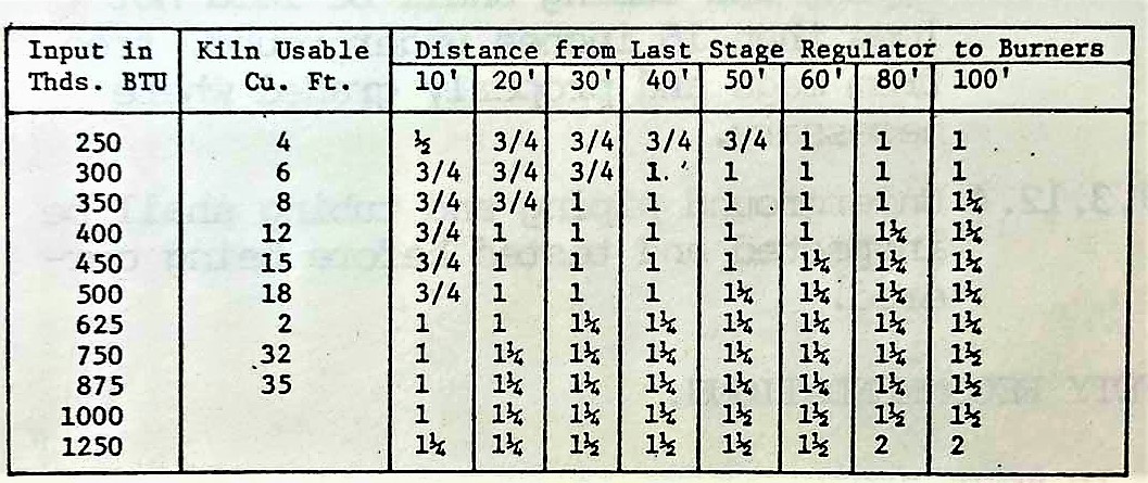 Following are regulations which are in effect in some areas and are good, logical rules. Where there are no regulations specifically written for kilns, it would be wise to follow them as guidelines. We suggest that these be shown to Inspection Authorities in such cases and they will know you are interested in having a good, safe gas installation.