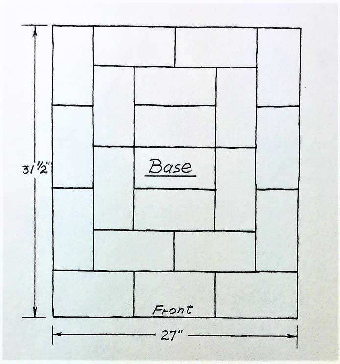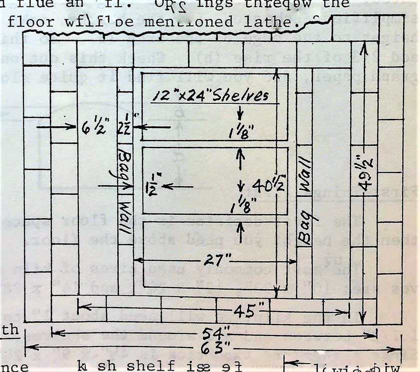 The setting floor is 24" wide by 36" deep with an inside height of 38". For those desiring a slightly larger kiln, increasing the height by 5" by the addition of 2 courses of bricks will bring the usable capacity to 20.5 ft3.
