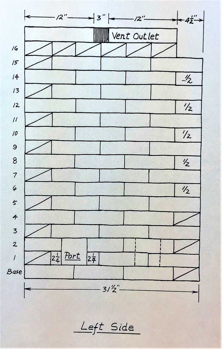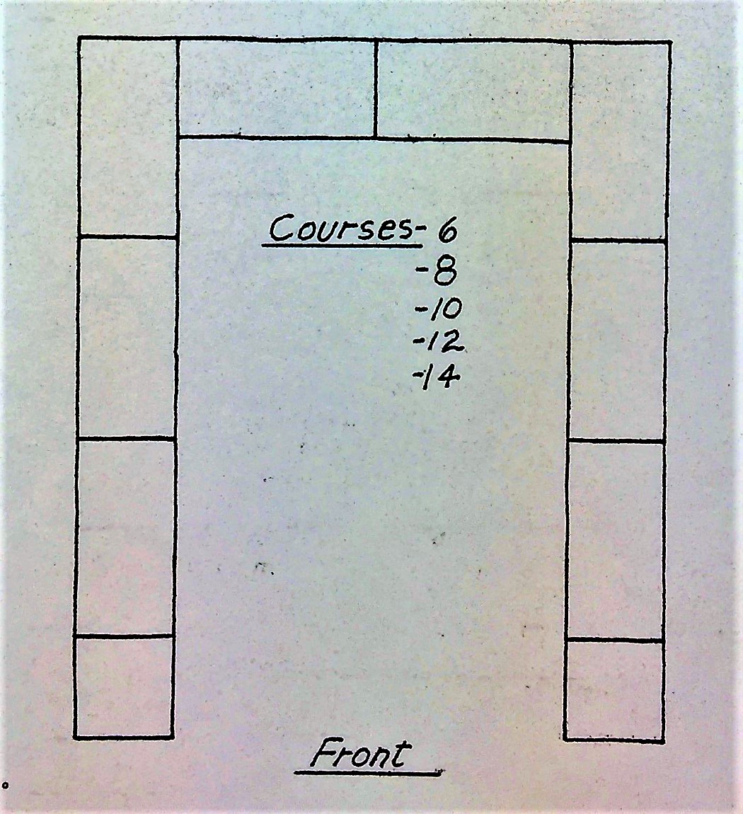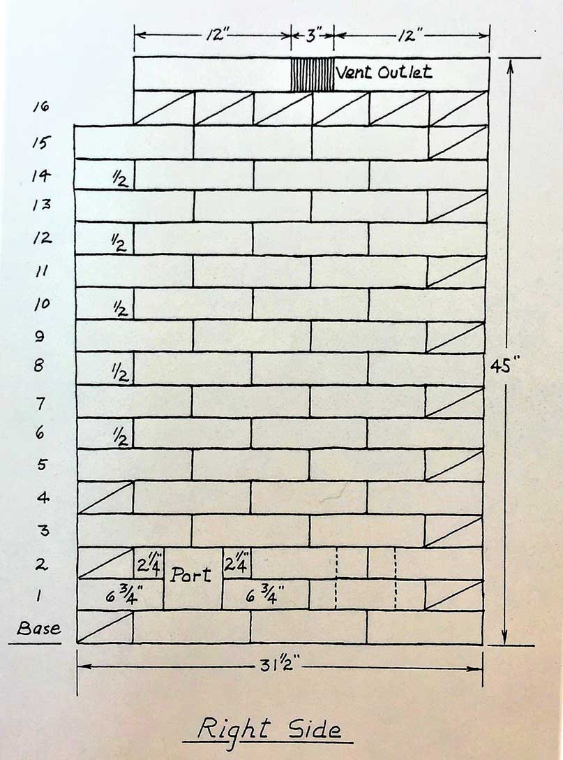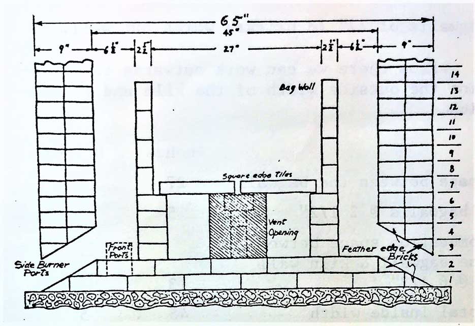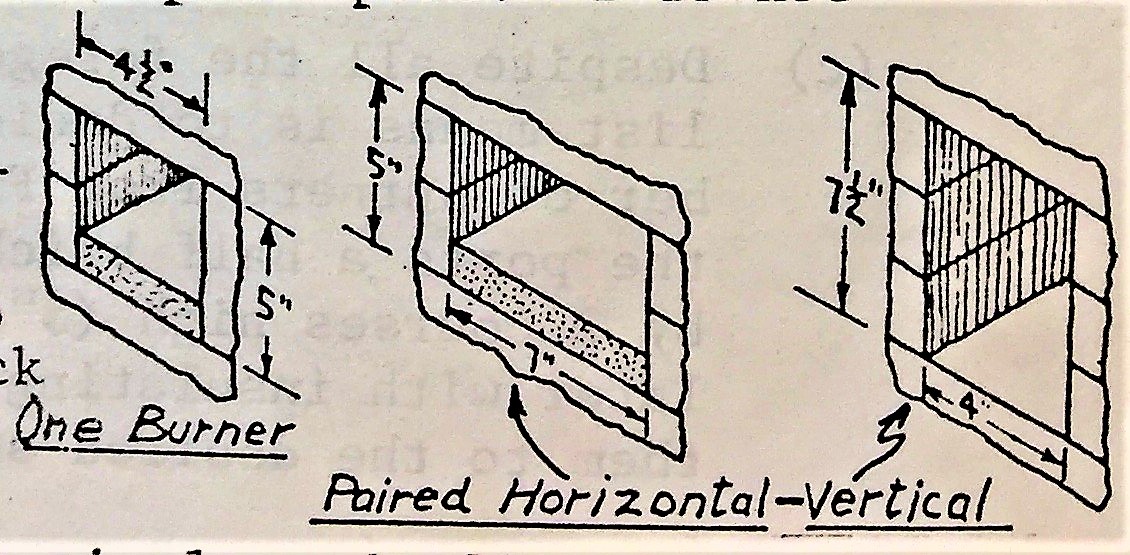 Despite all the foregoing, the simplest means is to decide on the number of burners from Figure 7 and build the ports a half brick wide (4 ½") by 2 courses high (5") and then later with insulating brick, reduce them to the desired size.