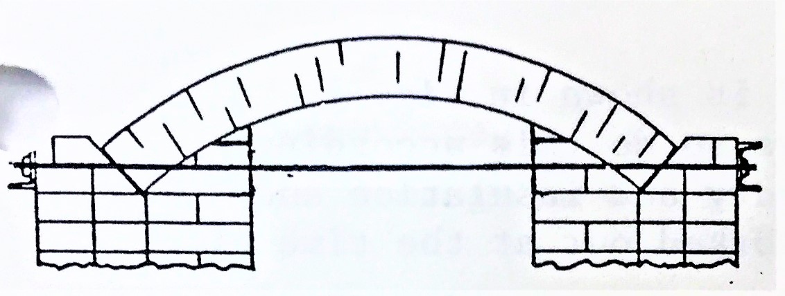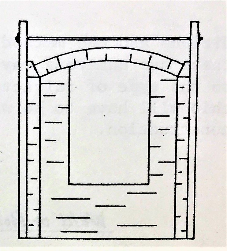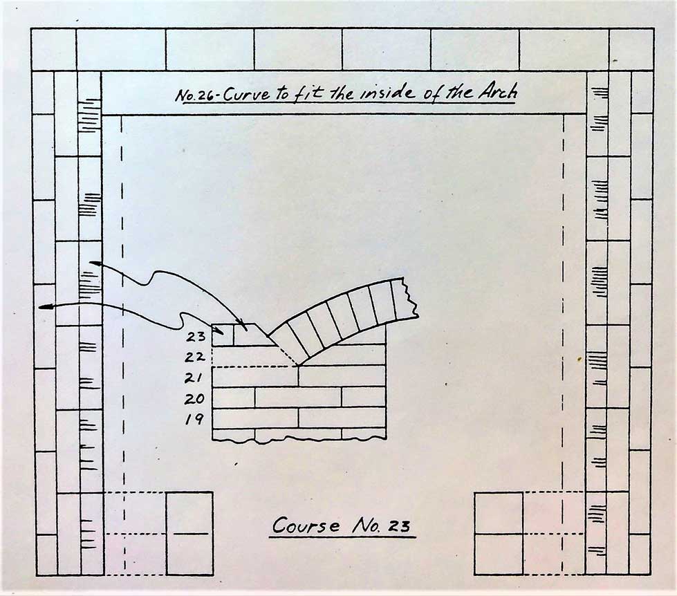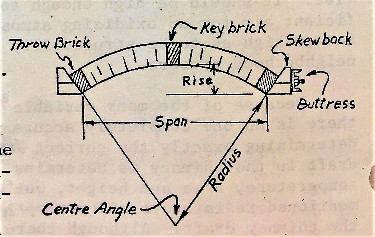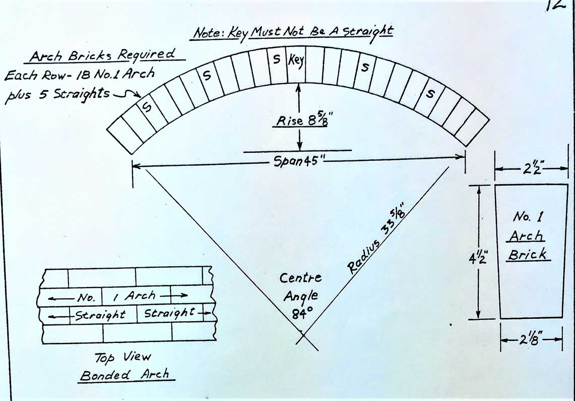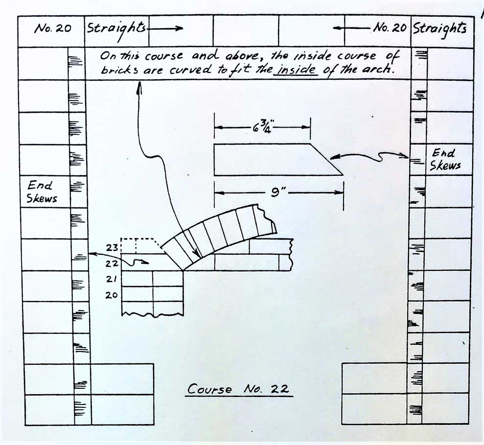 The Sprung Arch has a rise such that standard arch bricks are used and the skew bricks are a standard side skew. This is not so important where easily cut insulating bricks are used but is most important for hard firebrick.