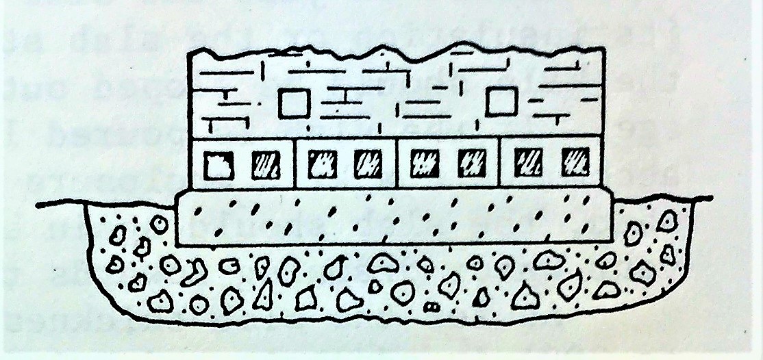We have all read that the foundation should go down below frost level. In this area where frost often goes down 8 ft. this is of course impractical. The secret is the drainage beneath the foundation slab and this can be accomplished by a 1 ft. bed of gravel. It should not be located in a low spot in the yard or any area where water may run or accumulate. If there is no other location, an extra deep bed of gravel should be prepared under the slab. As a further precaution to keep the bricks dry a course of concrete blocks could be set on top of the slab to ensure the bricks are high enough to keep dry.