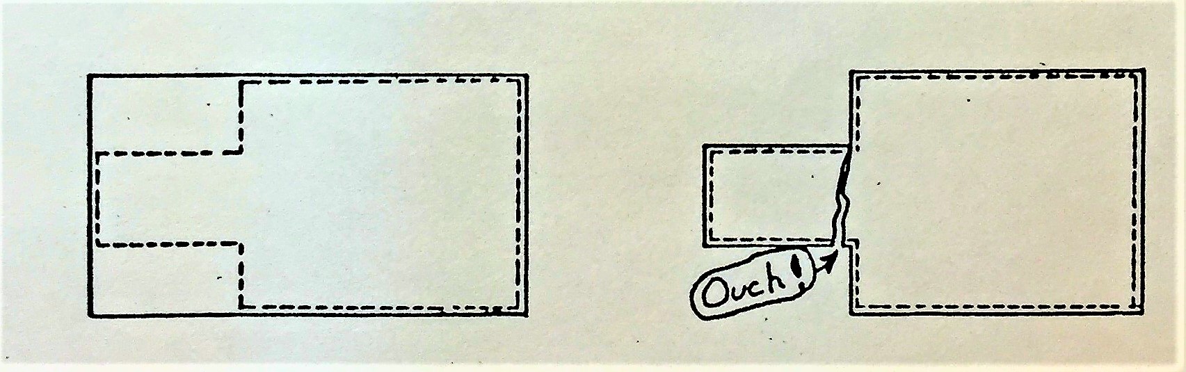 The weight per square inch on the chimney base considerably exceeds that on the base under the kiln so make the slab a full rectangle, as on the left, and don't try to save concrete as on the right, or you could have the chimney taking off on its own like a leaning tower.