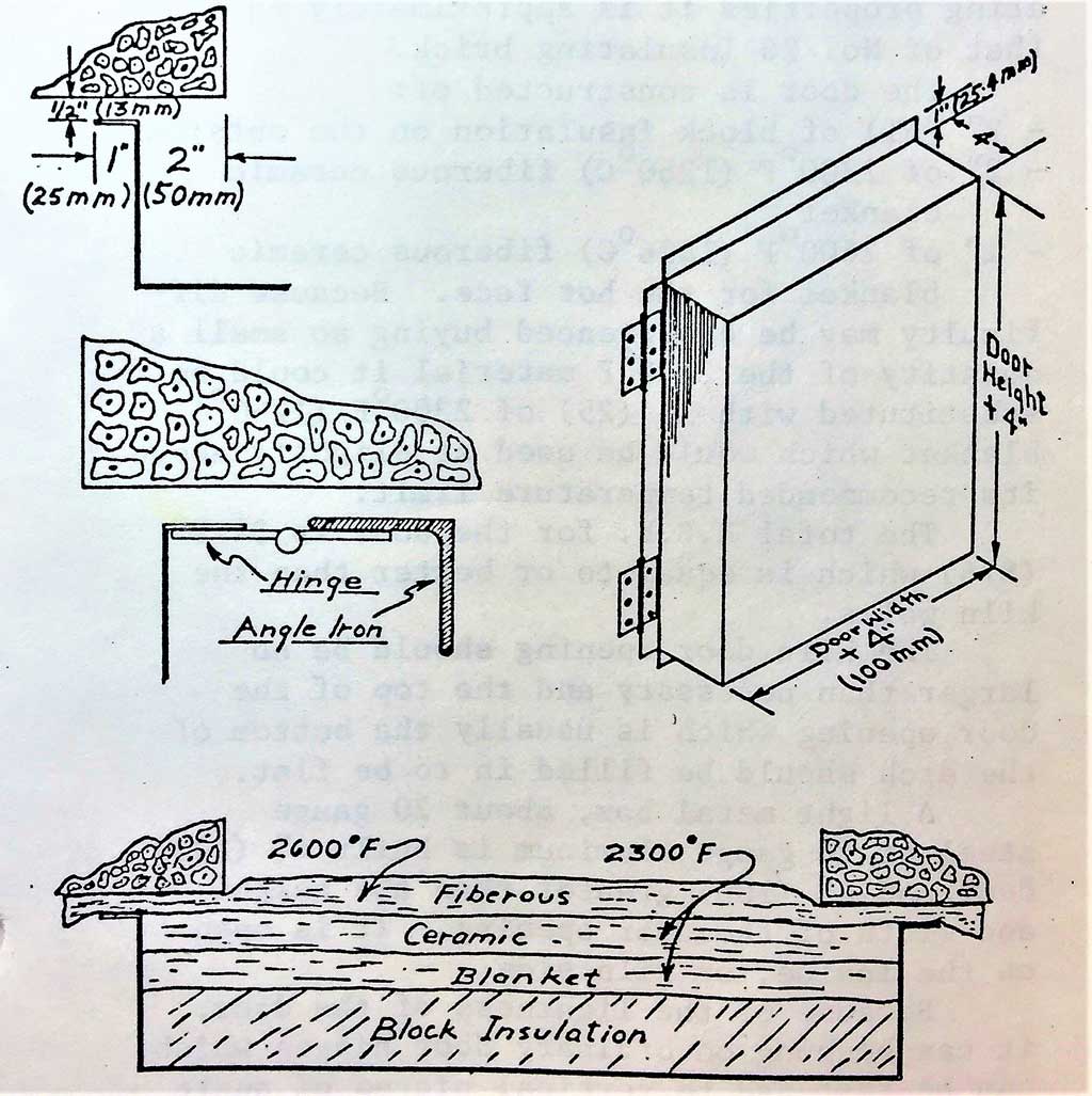 The availability of fibrous ceramics has changed all of that and it is now possible to make a close fitting lightweight well insulated door conveniently hinged.