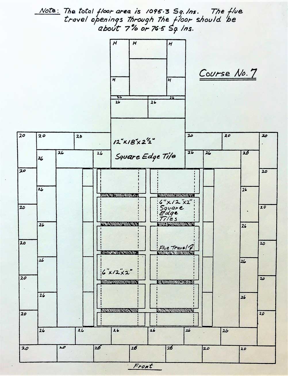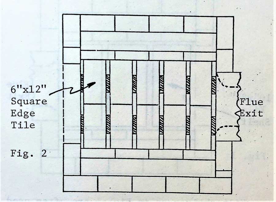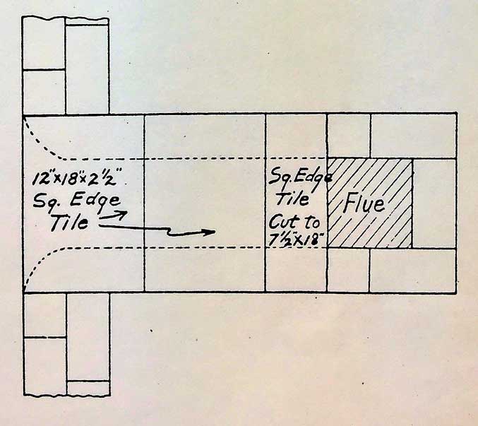 As the below image shows, the 6" x 12" square edge tiles work out very well and provide a large number of small slots so it is easy to obtain the 6 to 7% floor opening area. It will probably be found preferable to have the openings a little larger at the front where the draft is least and smaller at the rear closer to the flue exit where the draft is greatest. 'Another advantage of the square edge tile is that the cost is about one-quarter that of kiln shelves.