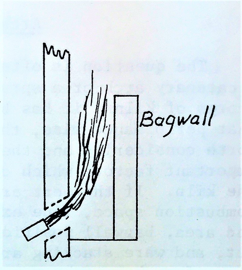 A catenary arch kiln, because of the inward sloping walls may have a tendency to overheat the wall opposite the top of the bagwall and reduce the stacking space higher up. This however can be partially overcome by sloping the top outside of the bagwall as in above image or by building the wall straight for a few courses before starting the arch.