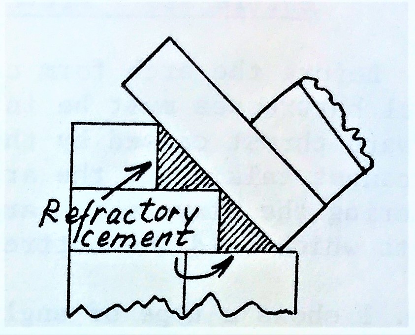 To build an arch of hard firebrick one is wise to purchase the No. 1, 2 or 3 arch bricks. However some potters are fortunate enough to find free used bricks and so wish to fuse them in the arch as well as the walls. Though not quite as satisfactory, it can be done and in this case, the wedge shaped gaps between the bricks are filled with refractory cement and bits of broken pottery as in following image.