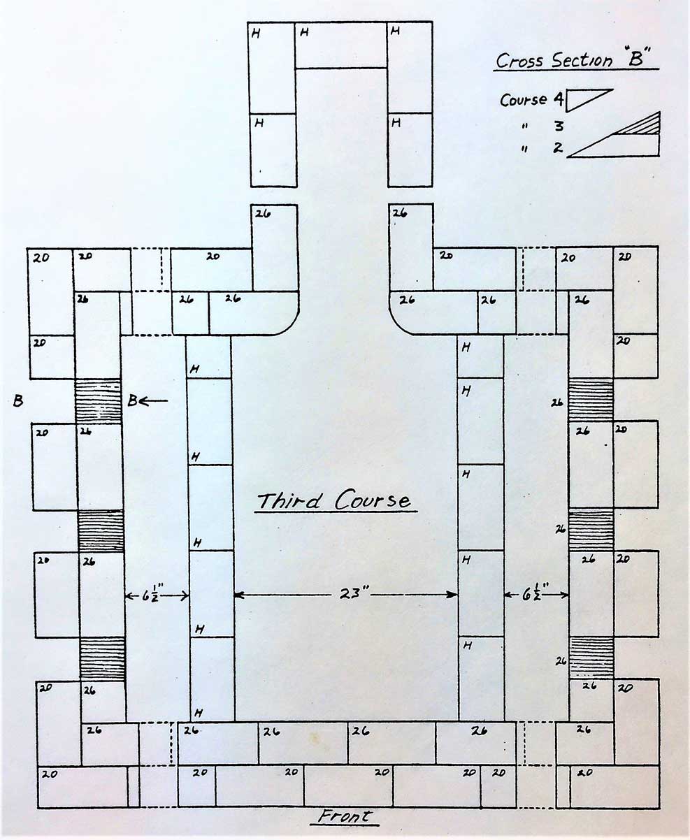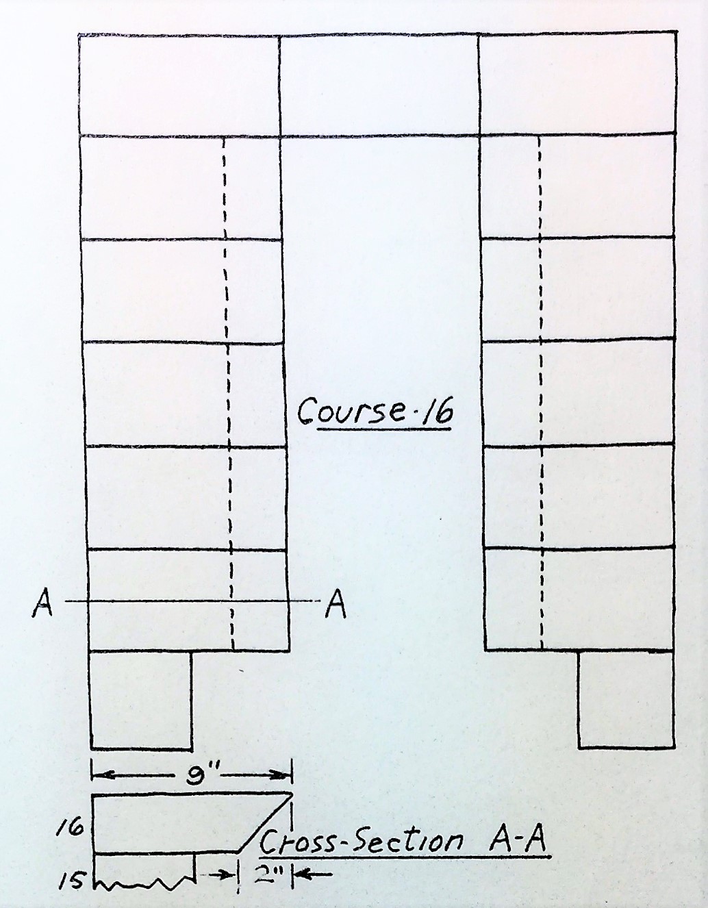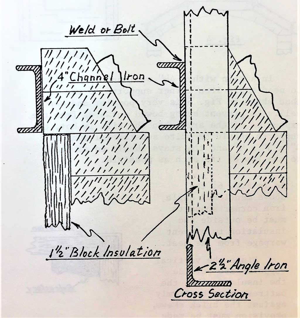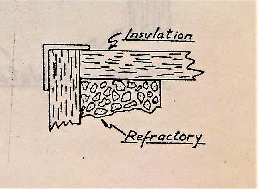 Since the vertical supports are outside the insulation but the buttress must be firmly against the brick skews, provision must be made to accomplish both conditions and one method is shown in following image. There are numerous ways to do this according to the type of refractory and insulation and this will have to be worked out at the time of construction.