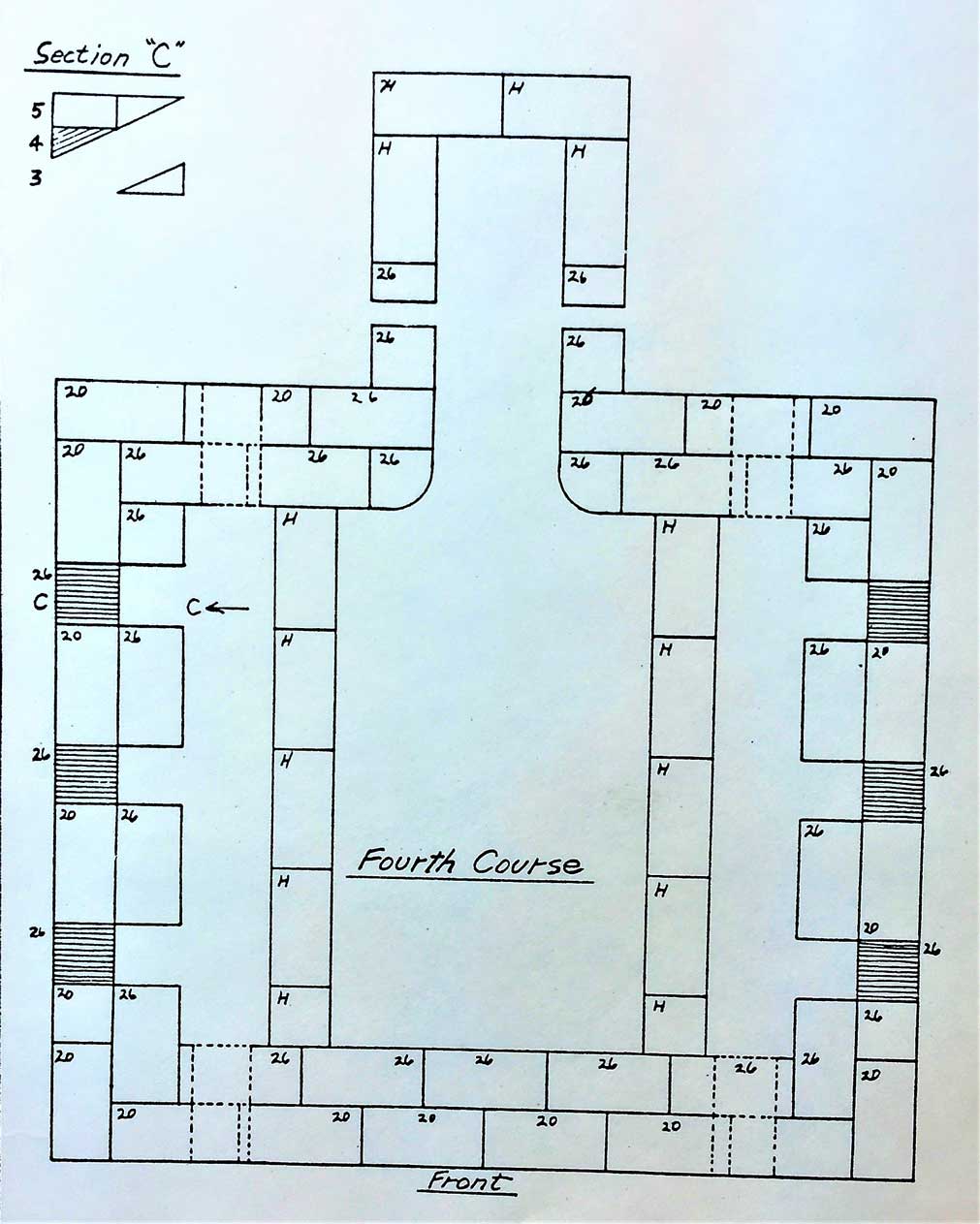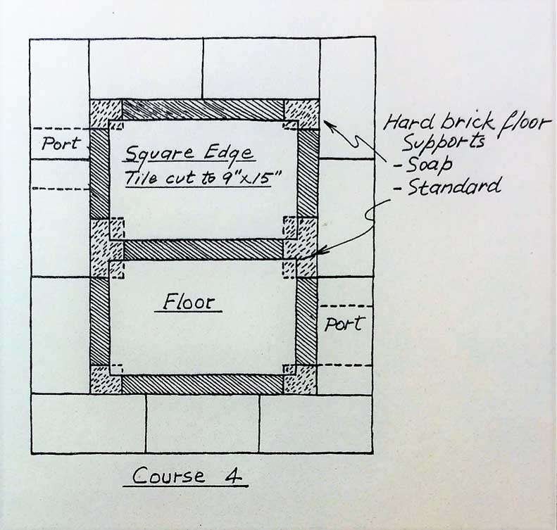 The correct sizing and positioning of the floor openings has much to do with obtaining an even firing from top to bottom and side to side. The sketches shown here are for course 5 of the 18 Usable ft3 kiln described later. The same idea however applies to a kiln of any type or size but the number and size of the shelves and the square edge tiles will vary to suit the design.