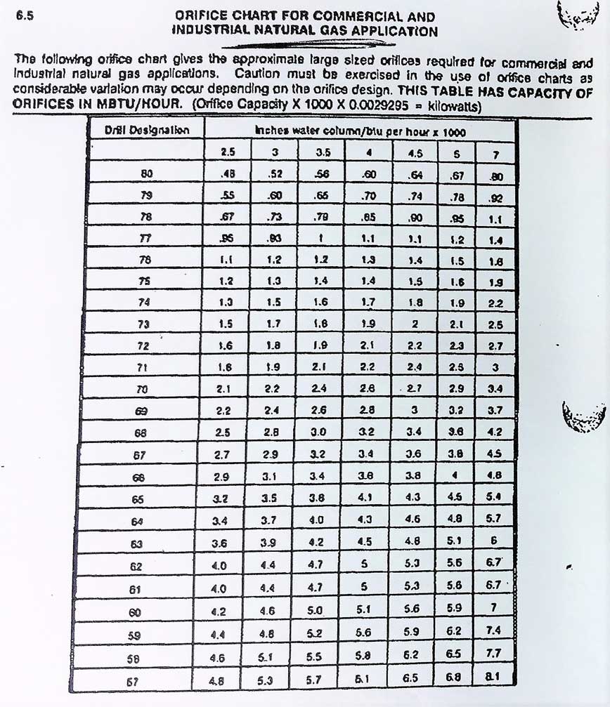 Figure 7 - The size of the kiln, the gas input required and the number of burners for Natural Gas and Propane.