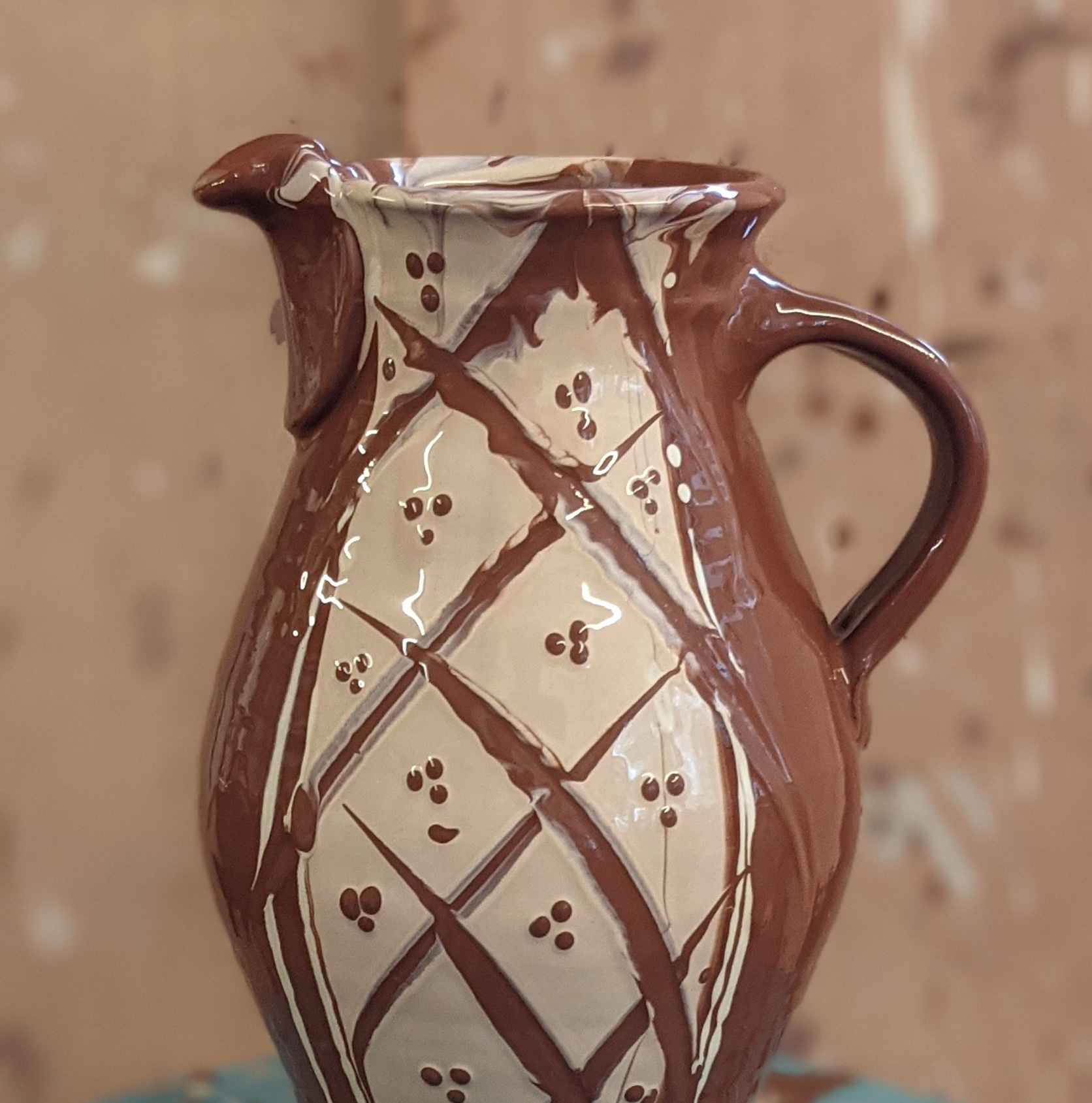 These thickly applied clay slips are defying gravity! This piece has just been engobed using a thixotropic brown slip. The white was applied over that by pouring and the decoration done by scoring and dripping. Both slips are very high in ball clay, no additive is necessary to make them thixotropic. The gelled state persists even with double or more the amount of water that would be in a glaze slurry. The rheology of both of these slurries, the brown underlayer and of the white overlayer, is the entire secret of how this is even possible. People who want to understand why things work come to digitalfire.com, one reader said the following about this page: "Thank you SO much for sharing this information, I have been searching for exactly what you are talking about here!" Photo courtesy of Russell Kingston, Lynmouth Slipware Pottery.