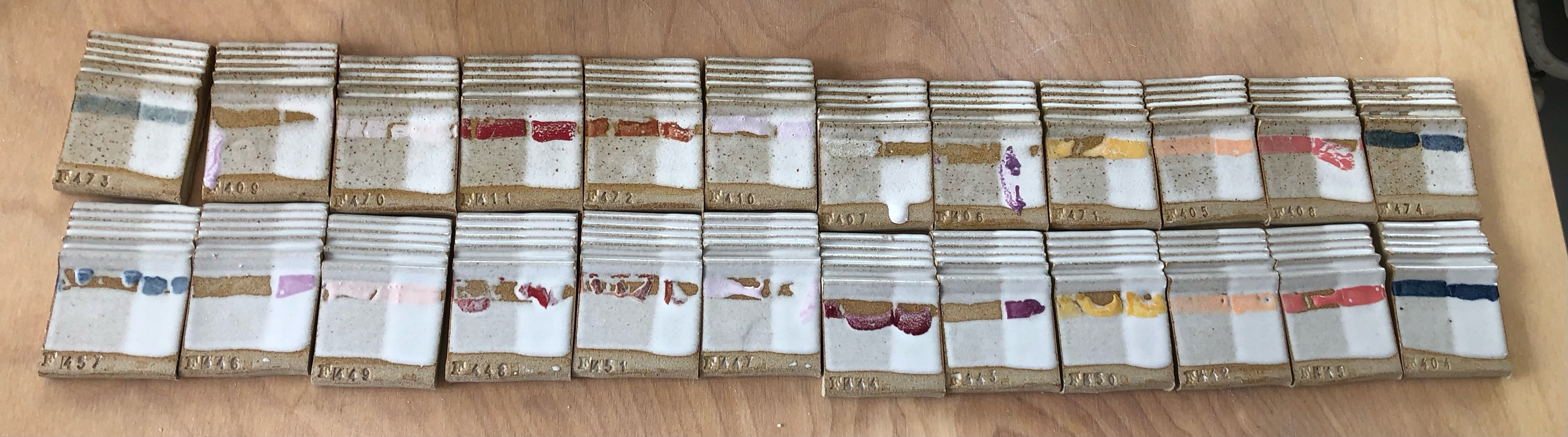 The original Italian majolica ware was red earthenware with a thick layer of tin-opacified glaze vibrantly brush-decorated using single-strokes of watery metal oxides. The water-color of ceramics. But tin oxide is no longer affordable. And ceramic stains are better. And no one uses lead glazes. So all majolica-like ware made today is actually “faux (false) majolica”. These test samples take the “faux” to the next level: Stoneware with a zircon-opacified white glaze. But almost all are crawling. If this happens for you ask these questions: