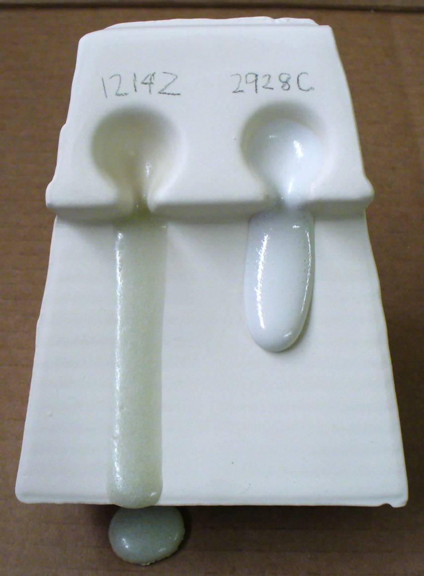 This melt flow test was done at cone 6 to demonstrate the difference in melt viscosity between a calcia matte (left) and a magnesia matte (right). In simplest terms, the former depends on a fluid melt to provide the needed mobility for tiny crystals to form during cooling, those crystals scatter the light and soften the surface to give the matte effect. The latter requires a stiffer melt to help prevent leveling during cooling and host phase separation to produce a surface that scatters light.
